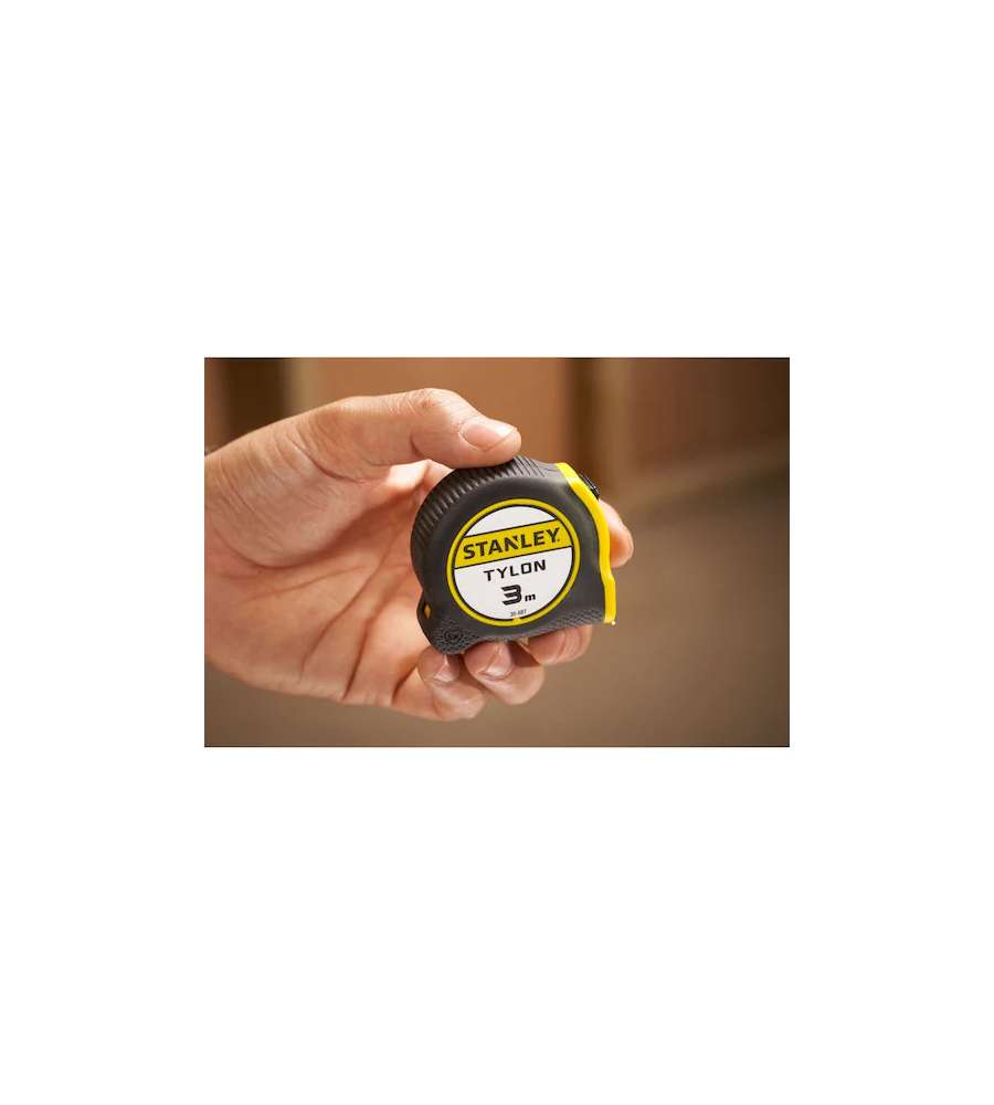 Flessometro Stanley Tylon 3m con nastro da 12,7 mm, cassa in ABS antiurto e rivestimento in gomma antiscivolo. Nastro con verniciatura polimerizzata e pellicola anti abrasione. Include clip d'aggancio per una facile portabilità.