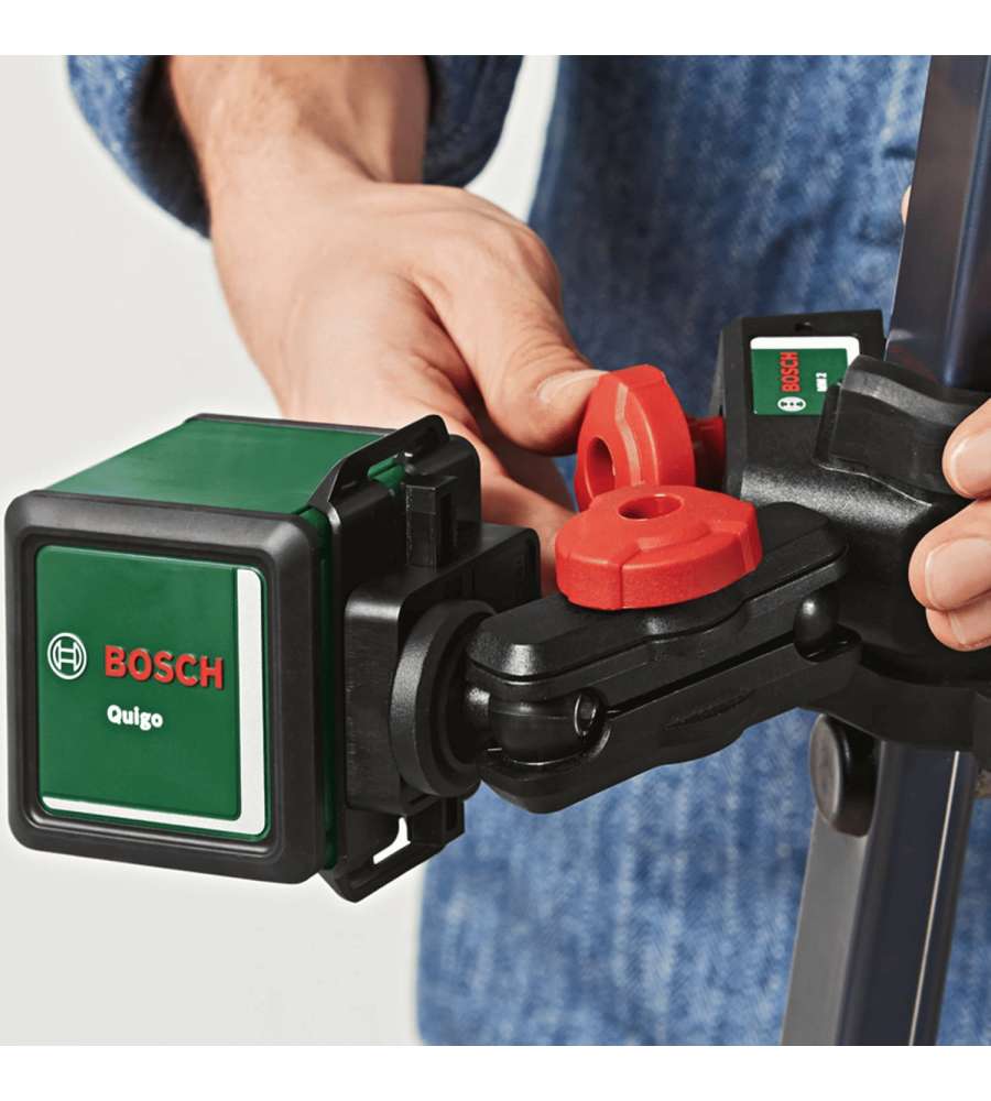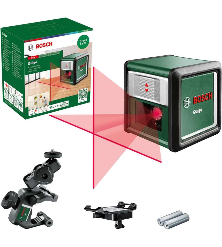 Descrizione: Livella laser a croce Quigo III Bosch, per allineamenti precisi fino a 7 m. Proietta linee orizzontali e verticali simultanee, con supporto universale MM2 e batterie incluse. Perfetta per fai-da-te!