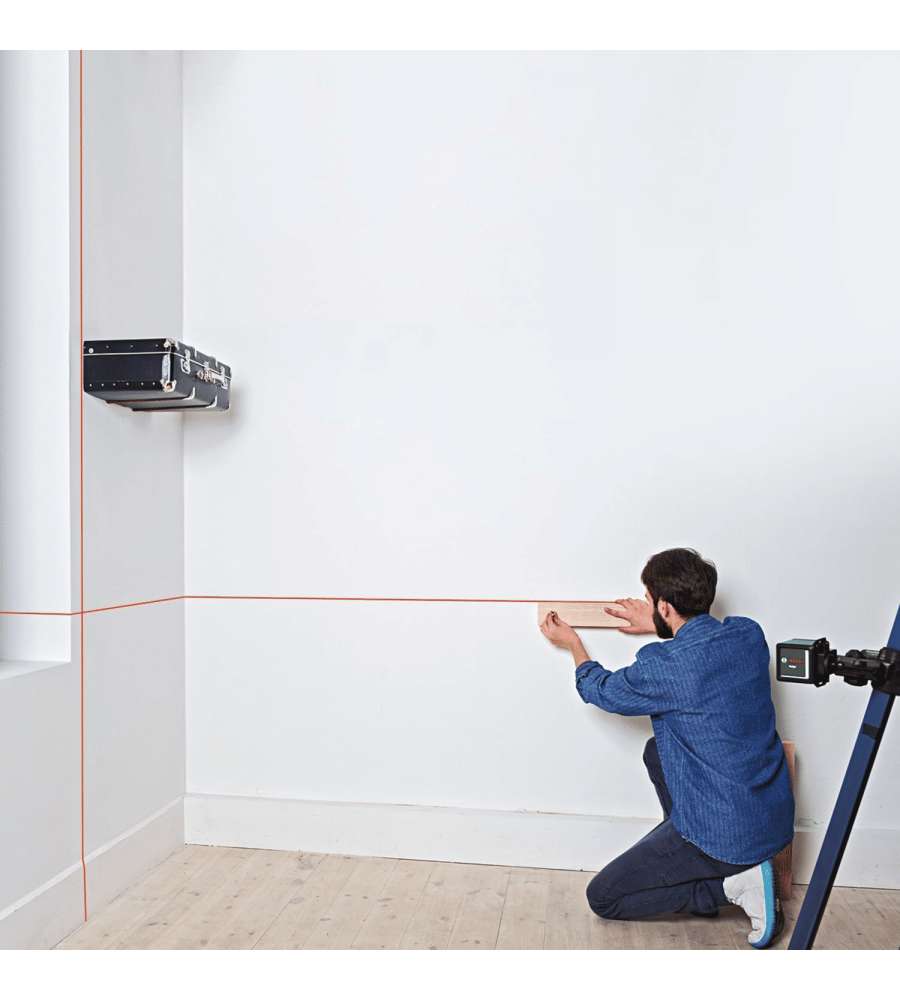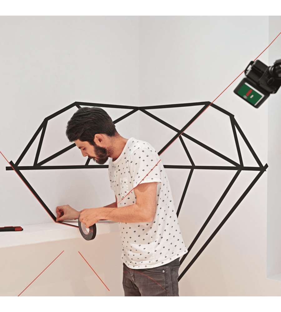 Precisione di +/- 0,8 mm/m per allineamenti accurati fino a 7 m. Proietta linee orizzontali e verticali simultaneamente, e inclinando l'utensile si possono ottenere linee diagonali. Include morsetto universale MM2 e 2 batterie AAA.