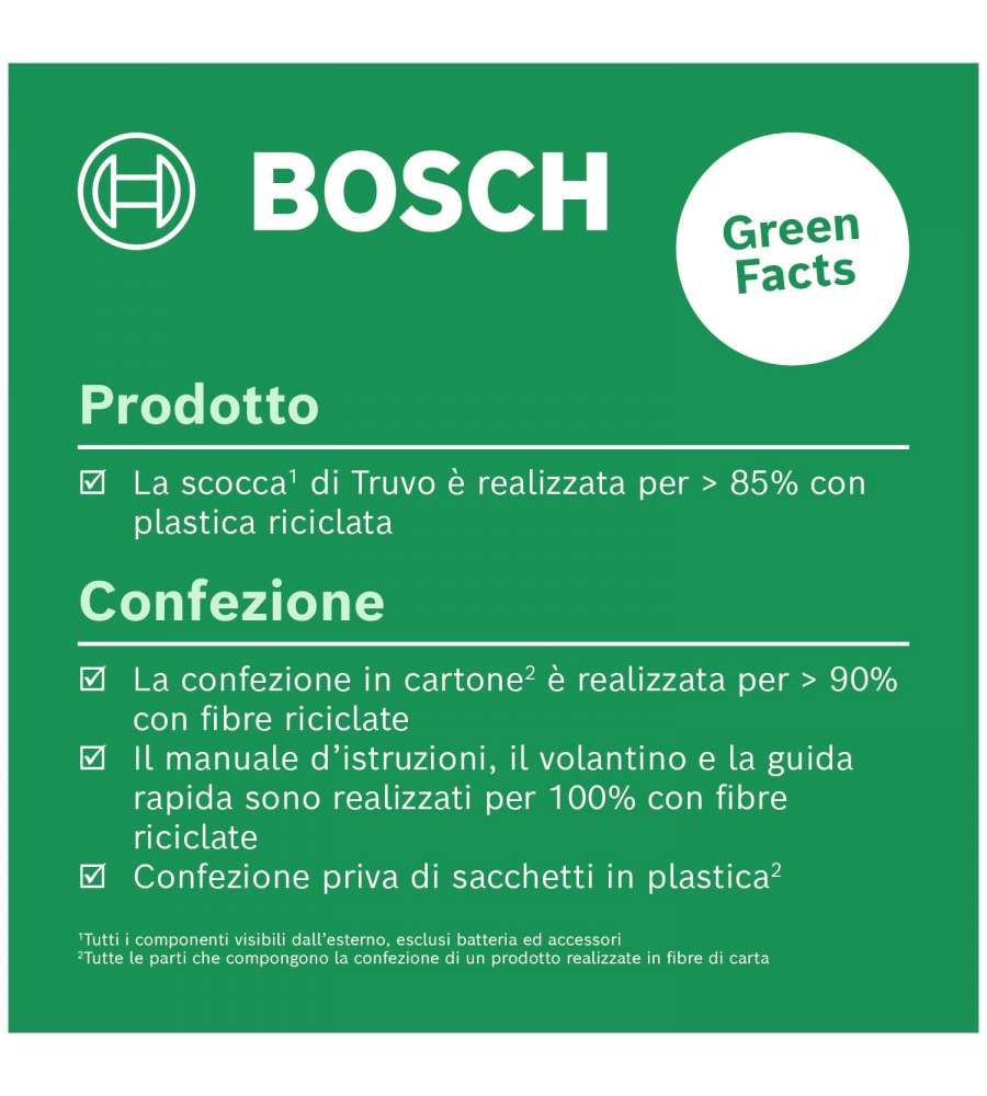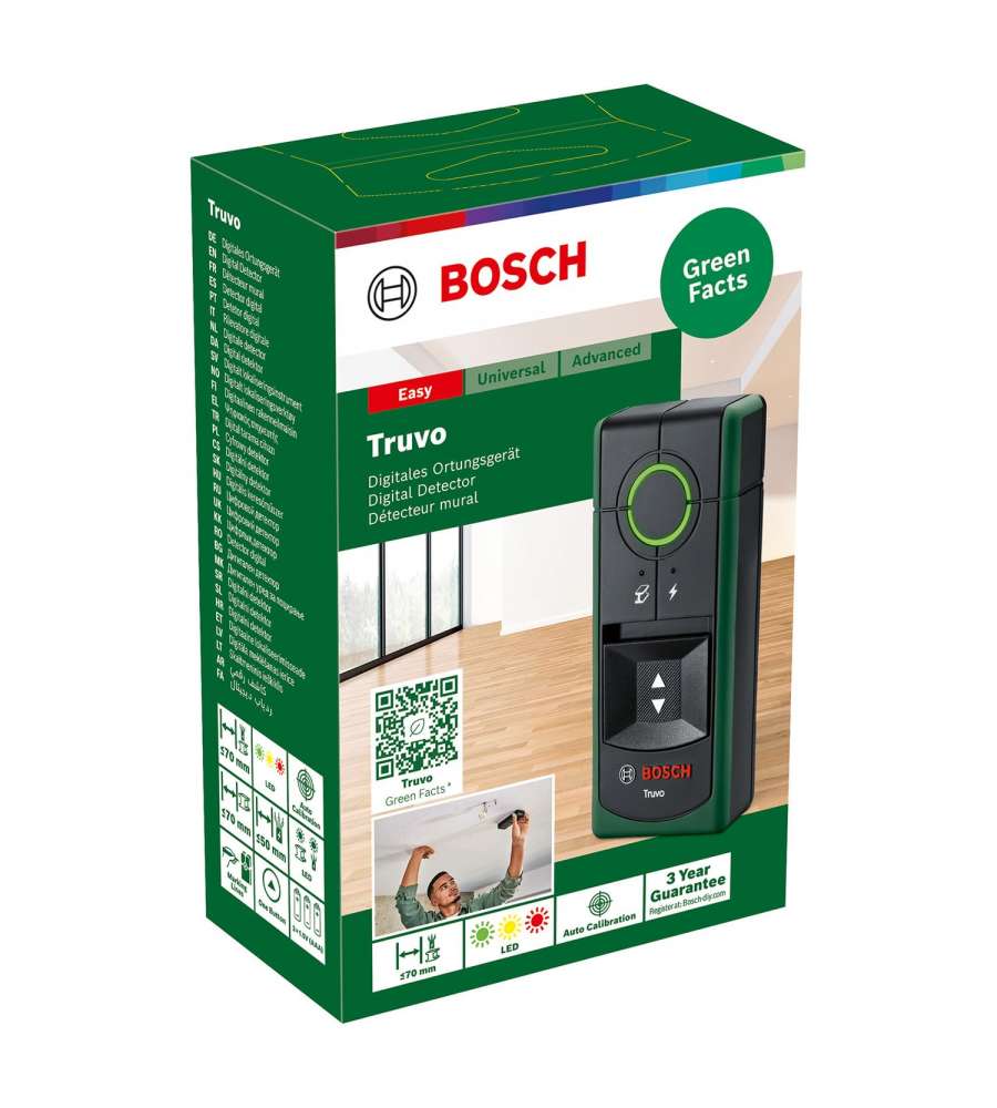 Rilevatore di metalli Bosch Truvo II, ideale per localizzare cavi elettrici e tubi metallici fino a 70 mm. Calibrazione automatica, utilizzo semplice con un pulsante, e indicatori LED per una rilevazione precisa. Dotato di 3 batterie AAA.Garanzia: