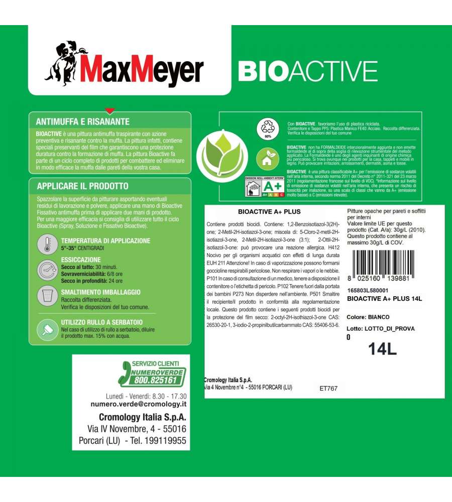 Descrizione: Pittura antimuffa MaxMeyer Bioactive A+ Plus in bianco, 14L. Ideale per interni, previene la muffa e risana le pareti. Pronta all'uso, opaca, a basso VOC. Perfetta per ambienti poco aerati.