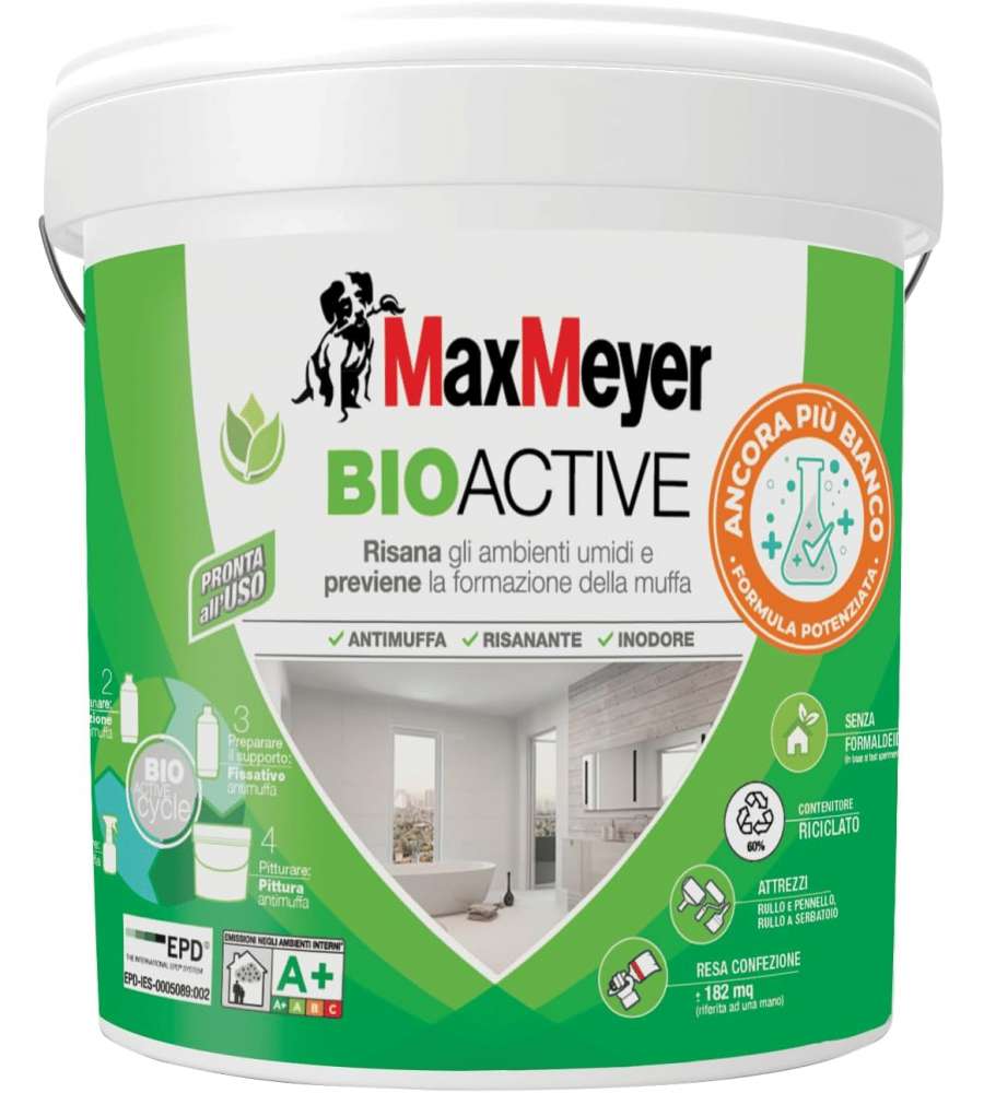 Pittura antimuffa MaxMeyer Bioactive A+ Plus, 14L, bianca e opaca. Ideale per interni, risana le pareti e previene la muffa. Pronta all'uso, inodore, a basso VOC. Copertura 12-14 mq/L, asciuga in 6 ore, ottima per ambienti poco aerati.Applicazione: