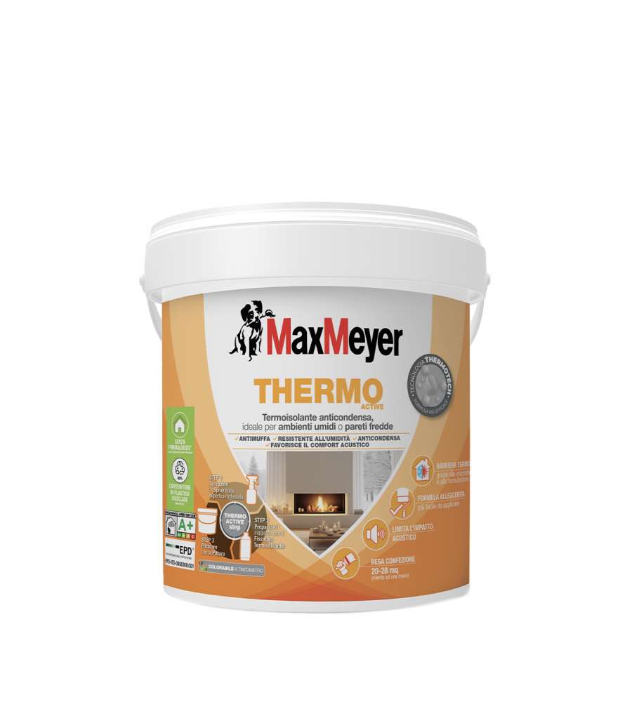 THERMO ACTIVE è una pittura termica anticondensa particolarmente indicata per locali ad elevata presenza di vapore come bagni, cucine e lavanderie, dove è più facile la formazione di condensa o muffa. Grazie alla tecnologia THERMOTECH, arricchita con microsfere di vetro cave e aerogel, il prodotto garantisce pareti più calde e asciutte, prevenendo la condensa superficiale. La sua formula alleggerita consente una stesura fluida e uniforme, riducendo lo sforzo durante l'applicazione. Inoltre, THERMO ACTIVE favorisce il comfort acustico nei locali, limitando la percezione del rumore.