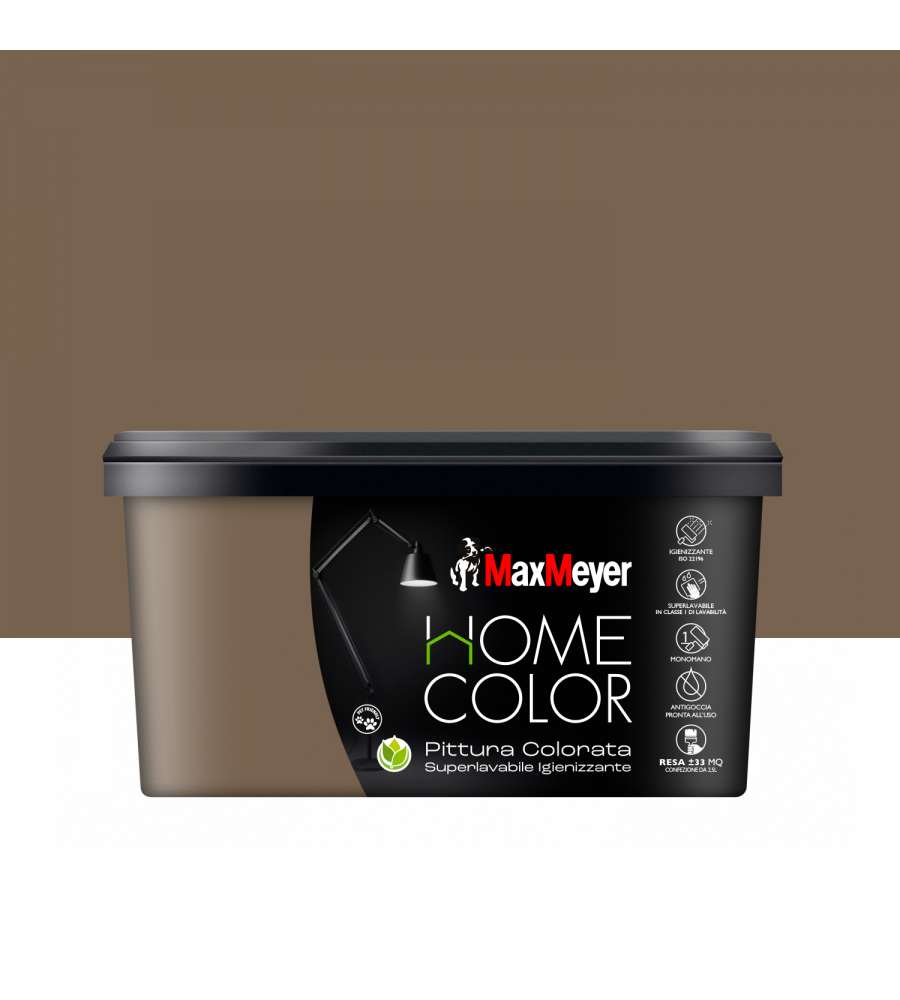 Descrizione: Idropittura superlavabile MaxMeyer Home Color, colore Marron Glacè, 2,5L. Resistente, igienizzante e inodore, con eccellente copertura e finitura opaca. Facile applicazione per interni.