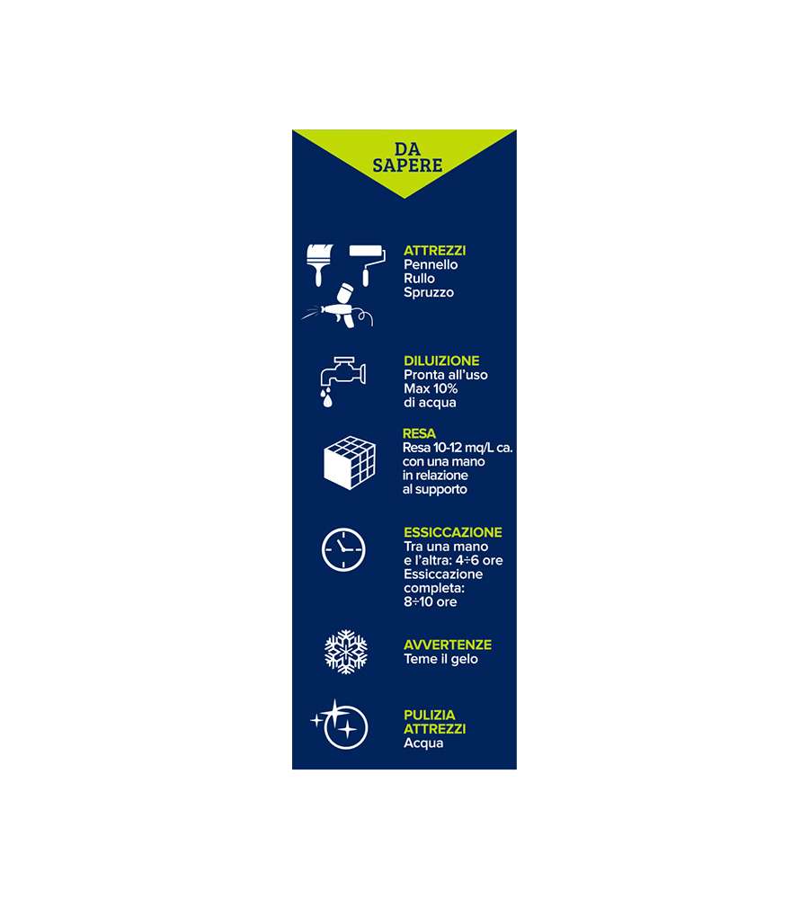 Idropittura lavabile bianca, copertura eccellente, ideale per ambienti interni non umidi come camere e soggiorni. Denso e pronto all'uso con max 10% acqua. Resa di 10-12 mq/l, seconda mano dopo 4-5 ore con essiccazione completa dopo 8-10 ore.Made in Italy: