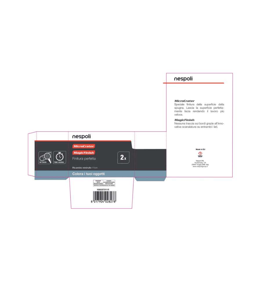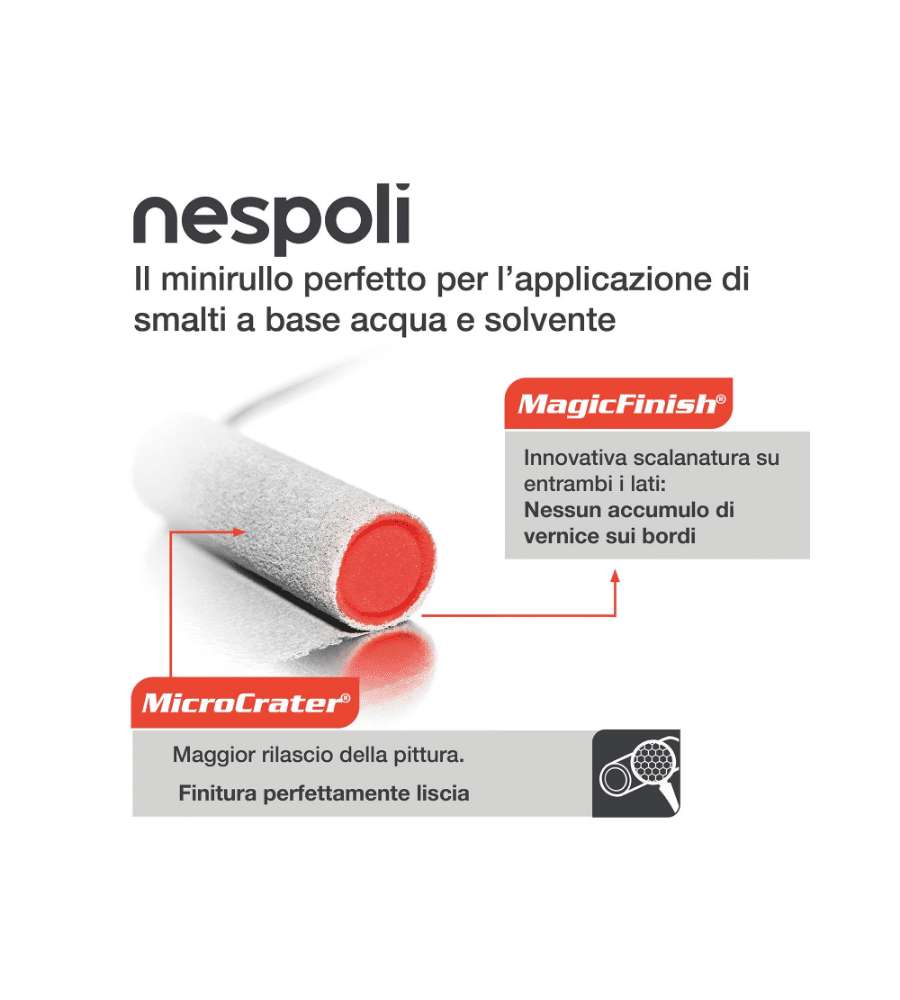 Descrizione: Scopri il minirullo Nespoli Magic Finish da 11 cm: include 2 ricambi ideali per pittura su superfici lisce. Applicazione uniforme di smalti a base d'acqua e solvente, per risultati professionali.