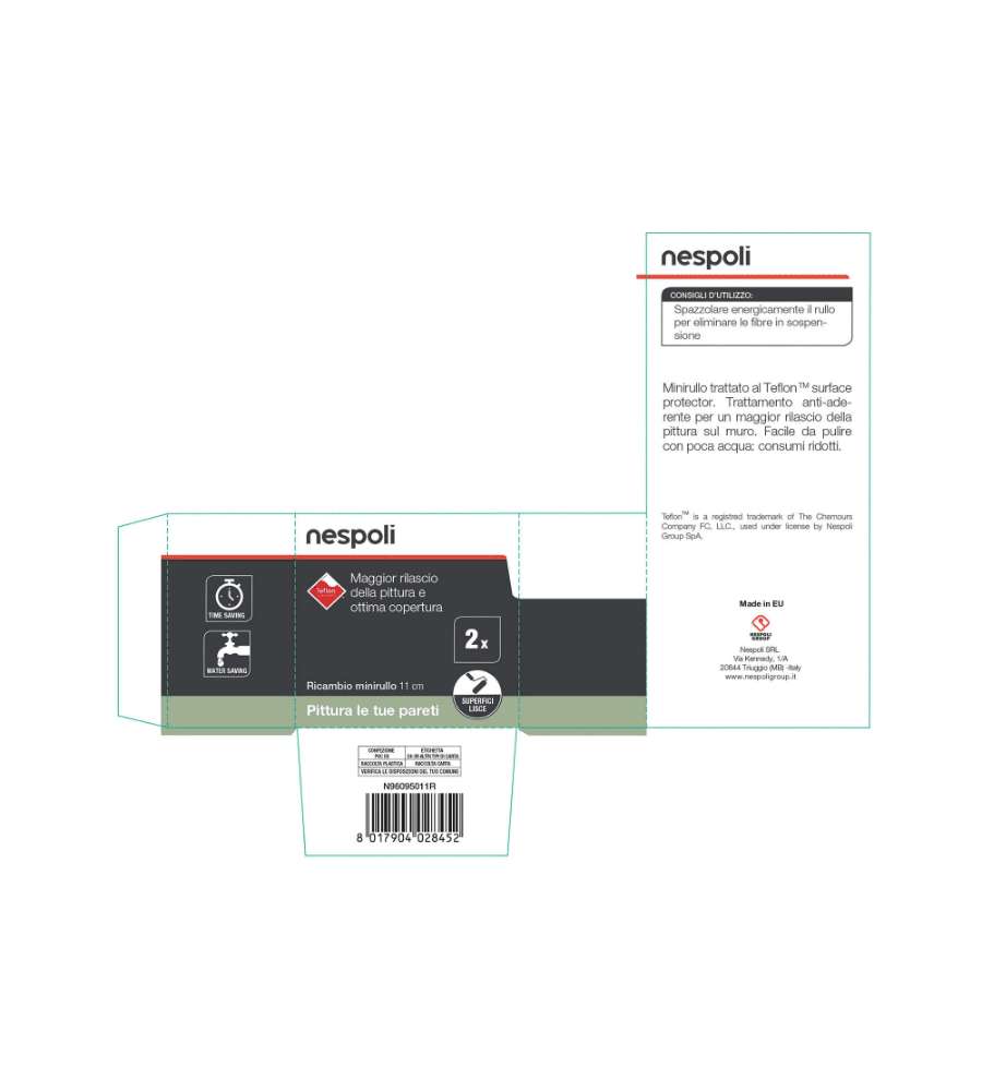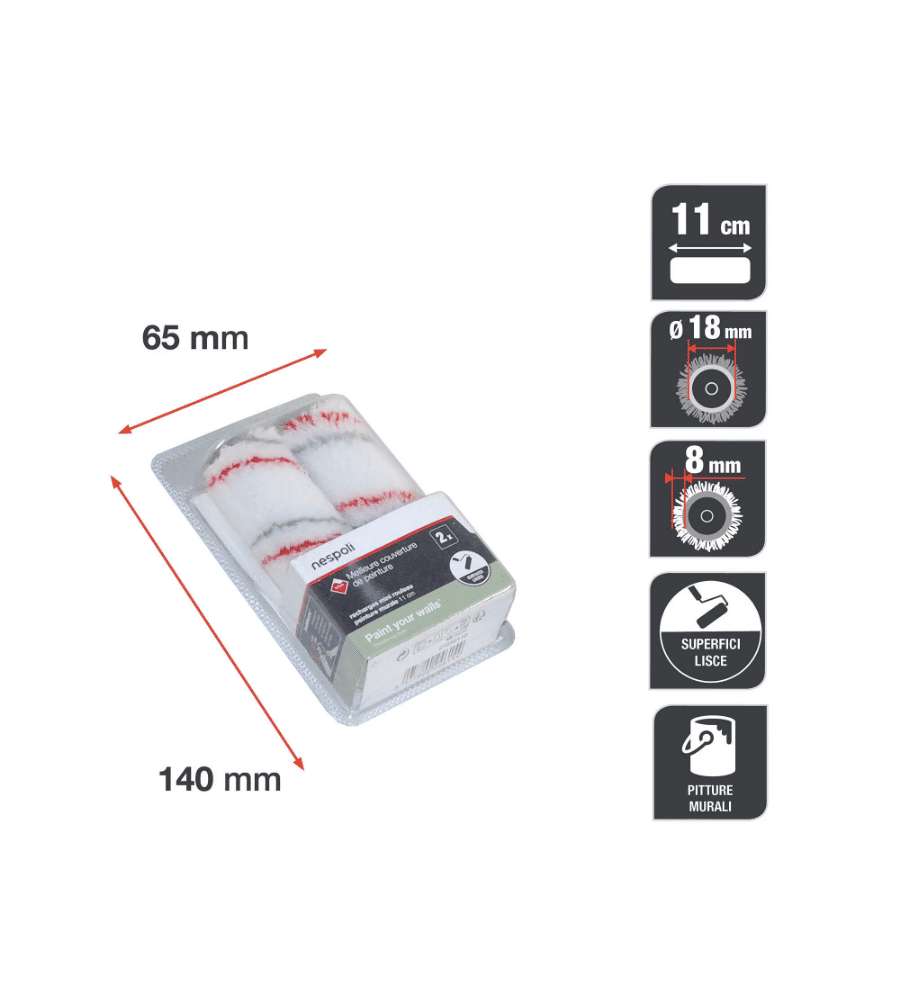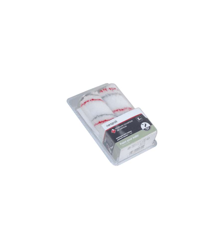 Descrizione: Set di 2 ricariche per mini rullo NESPOLI, larghezza 11 cm. Rivestimento in Teflon per una stesura uniforme e veloce su superfici lisce. Ideale per lavori di pittura interni ed esterni.