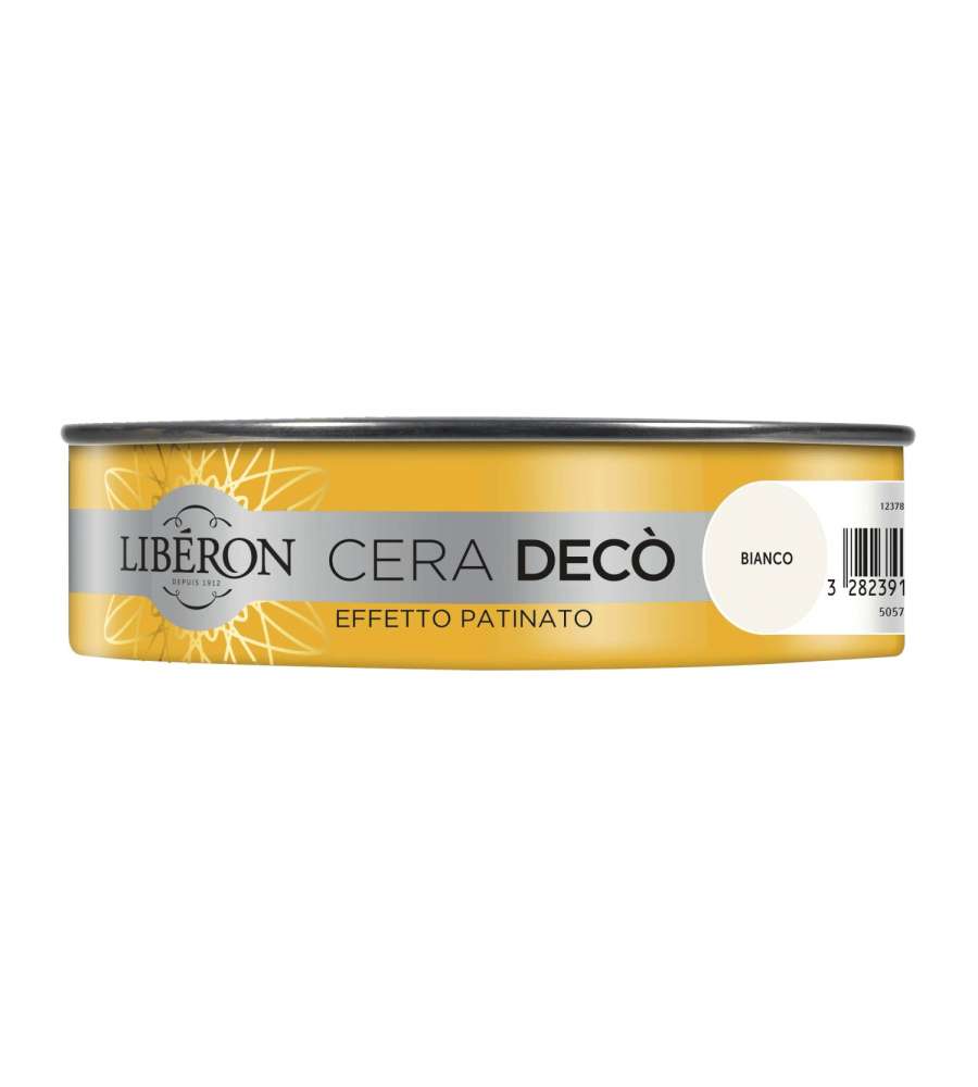 Cera Decò effetto patinato bianco per mobili e oggetti in legno, formula a base di cera di Carnauba. Asciugatura rapida in 2 ore, semplice lucidatura e profumo dolce. Copertura di 2 mq per confezione (1 armadio).Contenuto: