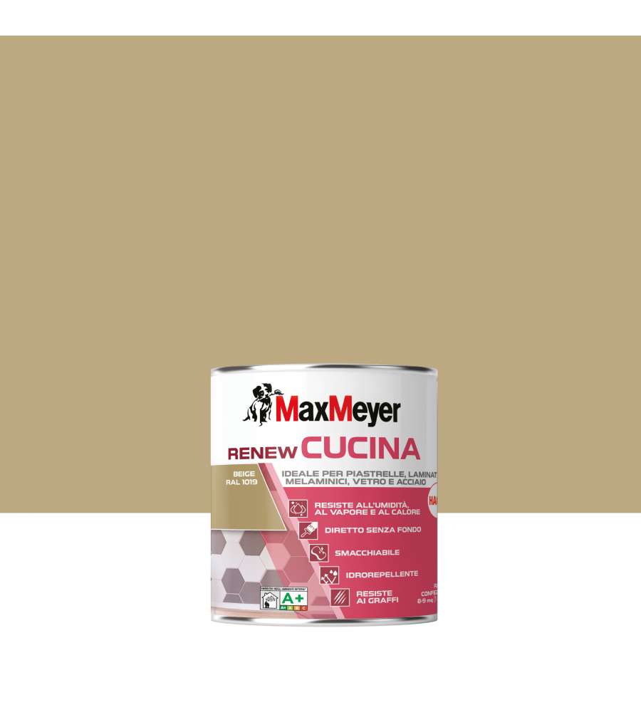 Descrizione: Smalto all'acqua satinato MaxMeyer Renew Cucina Beige 0,75L, ideale per interni. Resistente a umidità, calore e graffi. Pronto all'uso, smacchiabile e senza formaldeide. Copertura 10-12 mq/L.