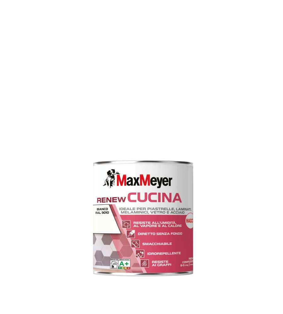 Descrizione: Smalto all'acqua satinato MaxMeyer Renew Cucina, 0,75L bianco Ral 9011. Ideale per interni, resiste a umidità e graffi. Pronto all'uso, senza formaldeide, per finiture impeccabili e durature.