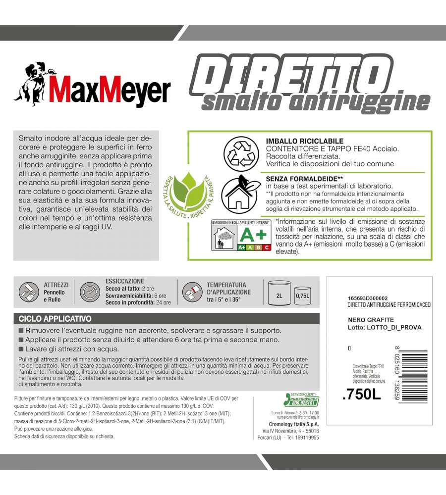 Descrizione: Smalto antiruggine diretto Maxmeyer Nero Grafite 0,75L, ideale per interni ed esterni. Asciugatura rapida, inodore e applicabile su metalli arrugginiti. Resistente agli agenti atmosferici e durevole fino a 8 anni.