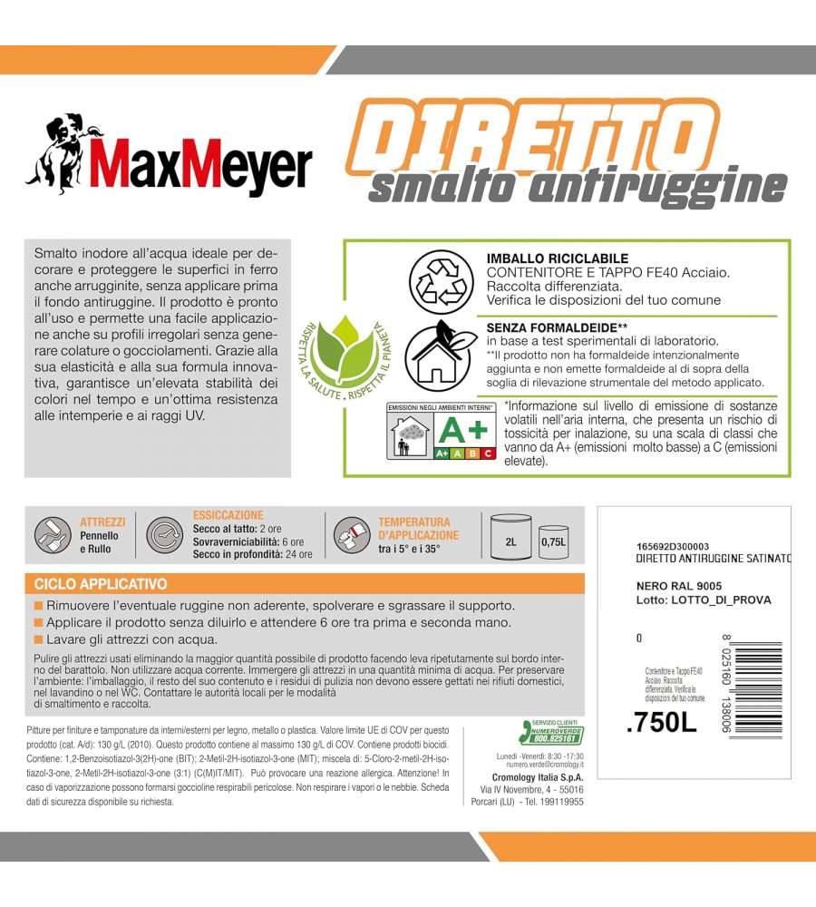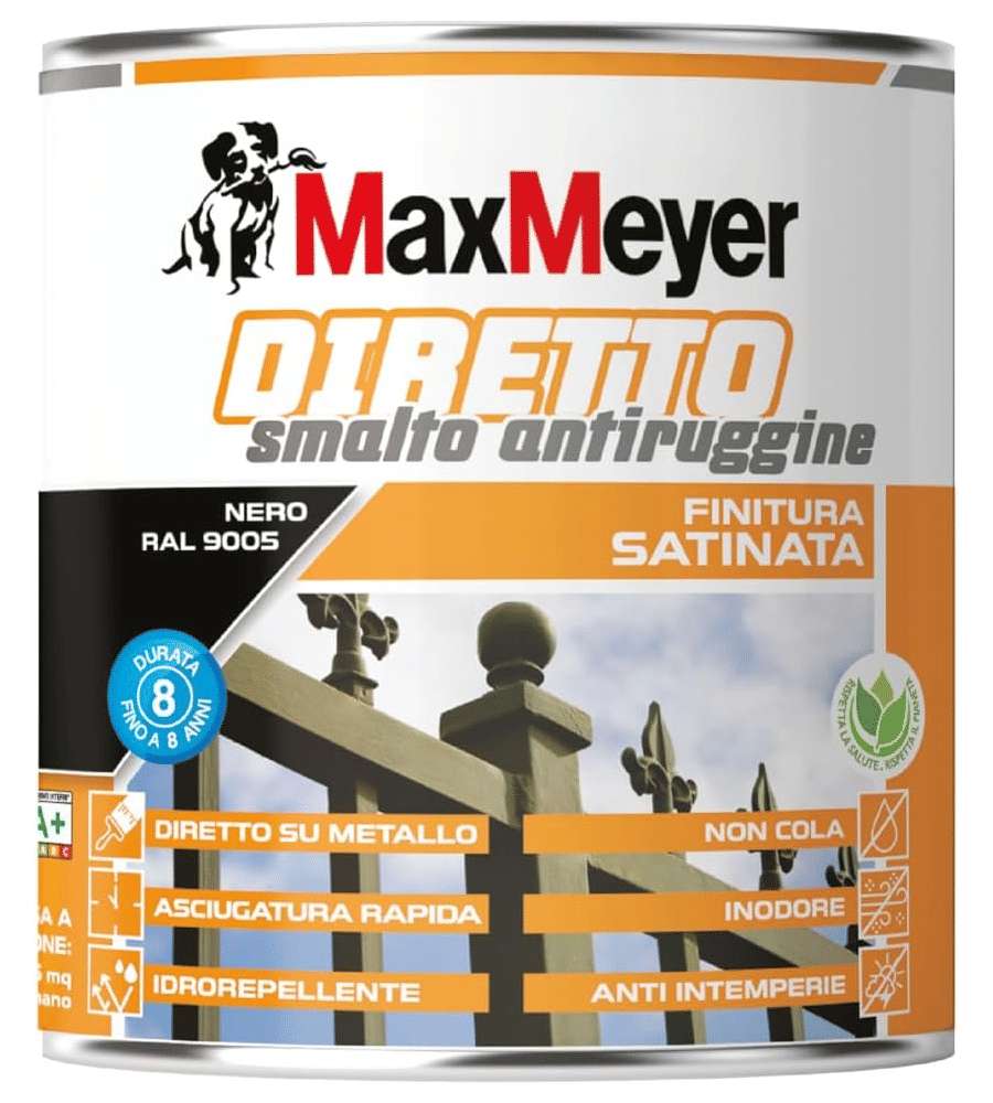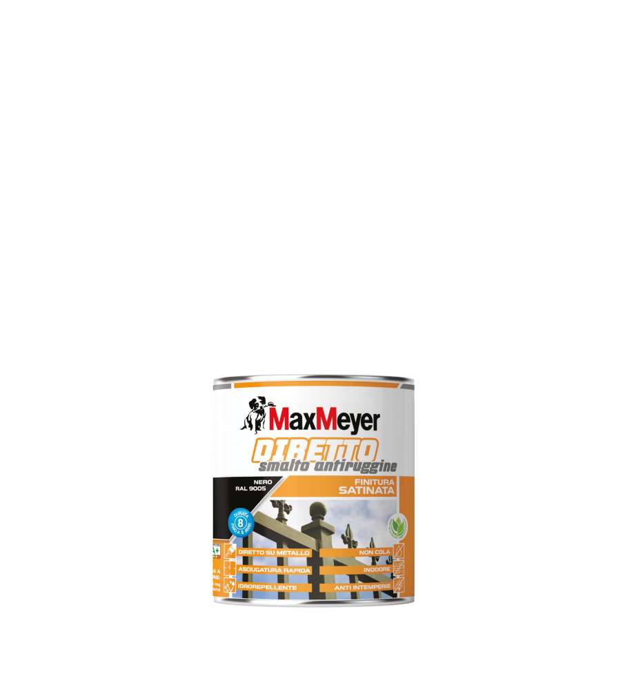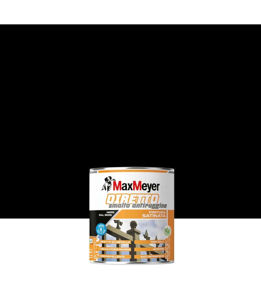 Descrizione: Smalto antiruggine satinato MaxMeyer in nero 0,75L, ideale per esterni e interni. Asciugatura rapida, resistenza agli agenti atmosferici e 8 anni di durata. Pronto all'uso e inodore.