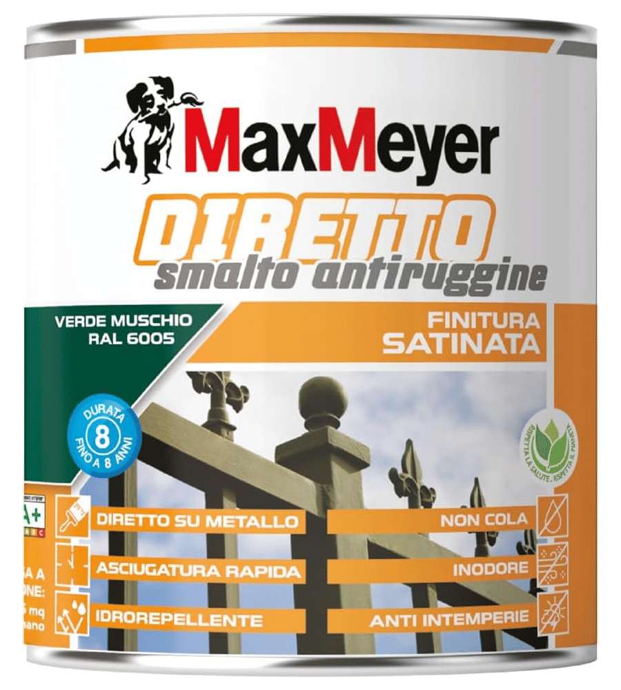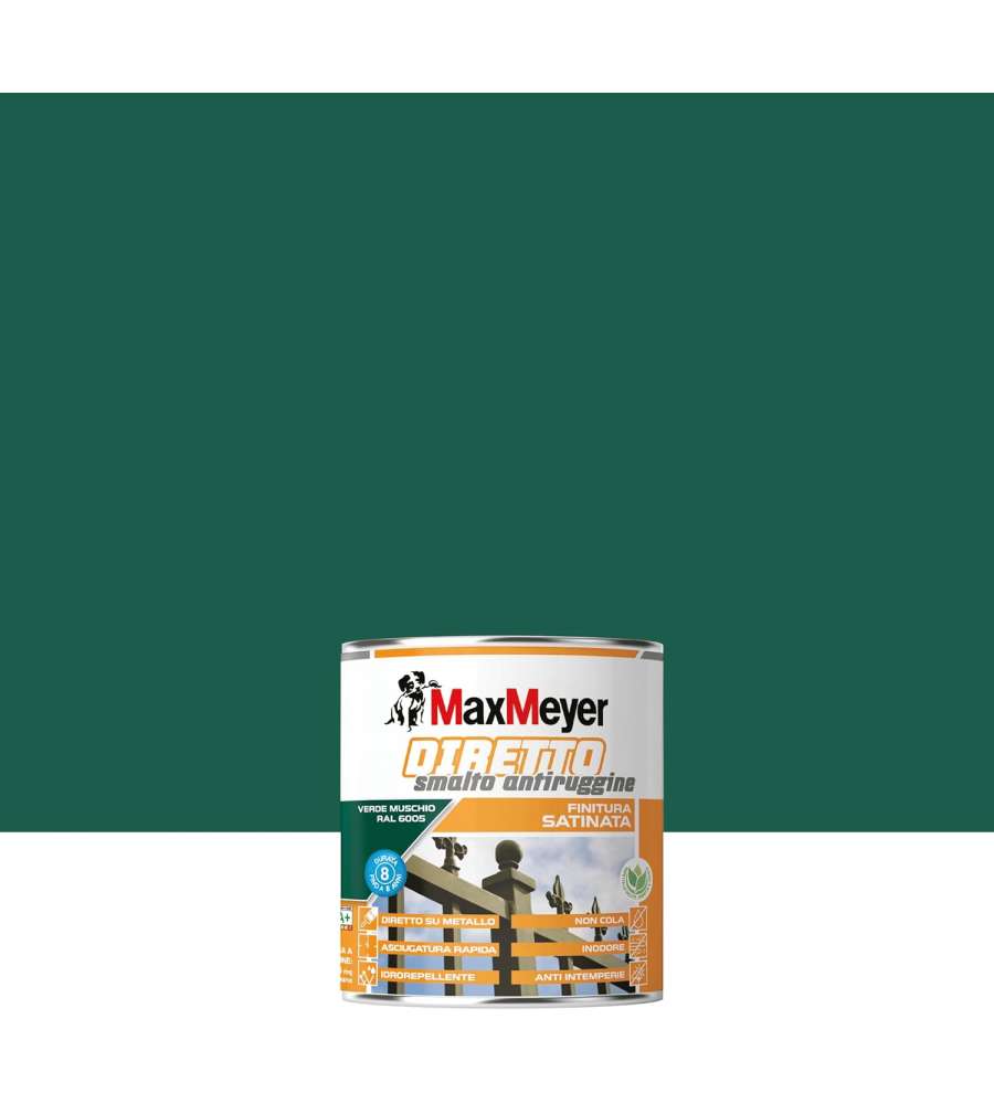 Descrizione: Smalto antiruggine diretto satinato MaxMeyer Verde Muschio 0,75L. Ideale per interni ed esterni, asciugatura rapida e resistenza agli agenti atmosferici. Perfetto su metalli arrugginiti, durata 8 anni.
