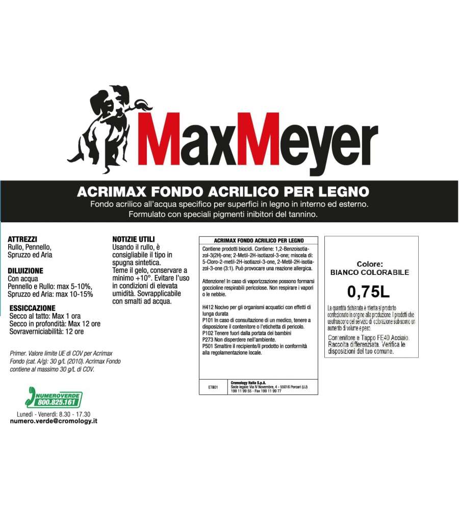 Descrizione: Maxmeyer Acrimax fondo acrilico per legno bianco, 0.75 L. Ottima lavorabilità e carteggiabilità, potere riempitivo e antitannino. Ideale per interni ed esterni, uniforma le superfici.