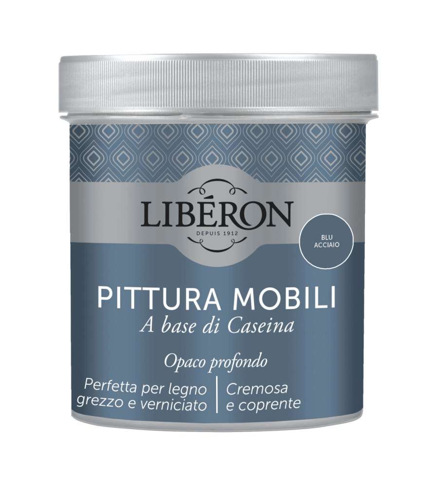 Pittura a base di caseina per mobili, colore Blu Acciaio, confezione da 0,5 l. Consistenza cremosa per un'applicazione facile, alto potere coprente, asciugatura rapida in 4 ore. Ideale per legno grezzo e verniciato. Resa 6 mq.Applicazione:
