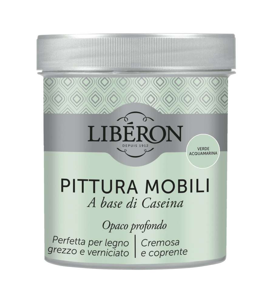 Pittura per mobili a base di caseina, colore verde acquamarina. Consistenza cremosa e alto potere coprente, ideale per legno grezzo e verniciato. Asciuga in 4 ore, copertura di 6 mq. Facilità di applicazione e profondità cromatica eccellente.Applicazione: