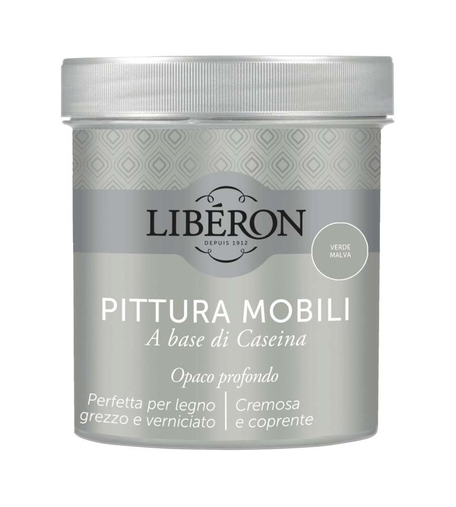 Pittura per mobili a base di caseina, colore Verde Malva, 0,5 l. Consistenza cremosa per un'applicazione facile e uniforme. Alto potere coprente e tenuta perfetta. Asciugatura rapida in 4 ore, resa fino a 6 mq. Finitura opaca.Uso interno: