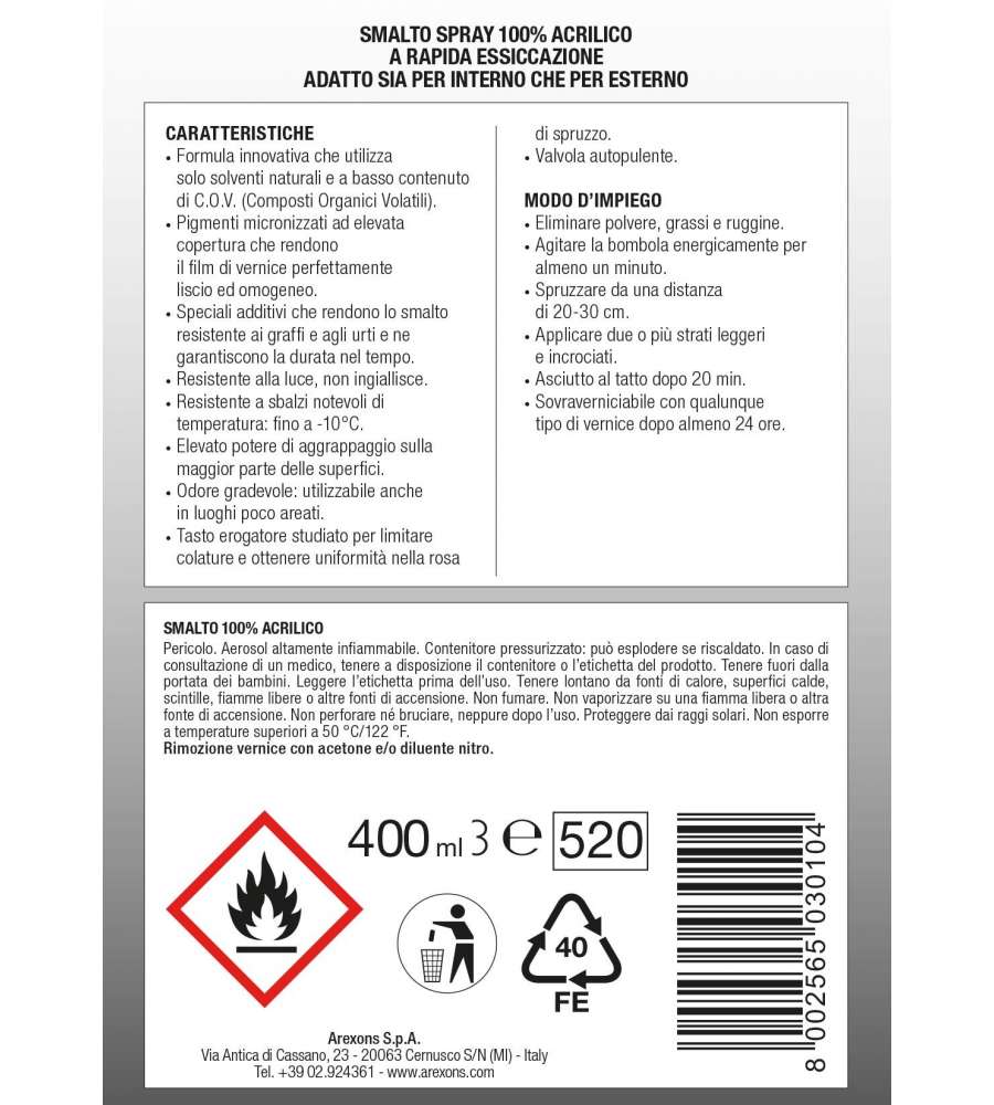 Descrizione: Smalto spray protettivo trasparente opaco Arexons da 400 ml. Ideale per superfici interne ed esterne, offre resistenza agli agenti atmosferici. Resiste anche a graffi, urti e protegge dalla luce. Facile applicazione con valvola autopulente.